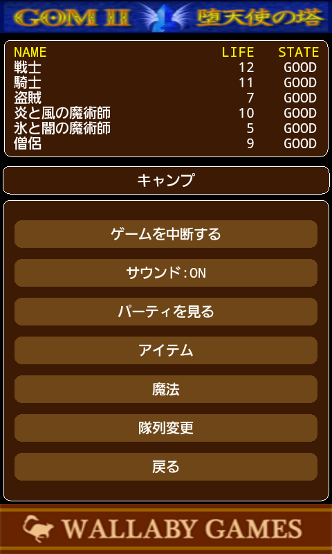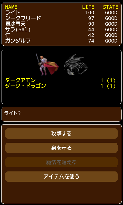 戦闘突入直後から、パーティの行動を決定します。 >>戦う(前衛のみ) 装備している武器で、直接攻撃を試みます。 >>身を守る(前衛/後衛) 行動を取らず、敵の攻撃に備えます。 >>魔法を使う(前衛/後衛) 所持している魔法を使用します。 >>アイテムを使う(前衛/後衛) 所持している道具を使用します。