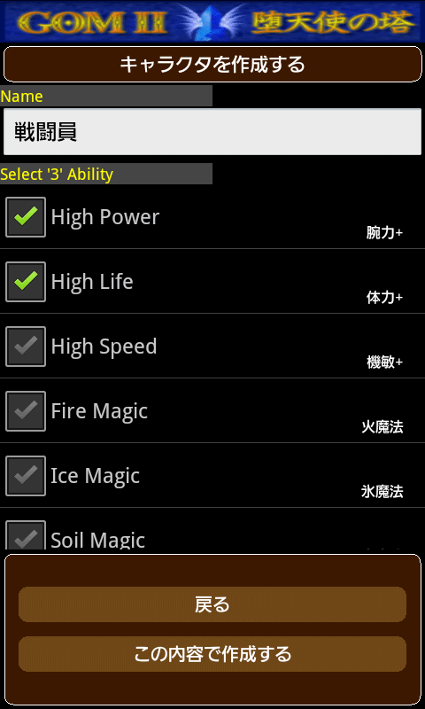 「冒険者の酒場」-「キャラクタを作成する」を選択すると、キャラクタを作成する事ことができます。 名前を入力し、続いて能力(アビリティ)を選択します。 キャラクタの能力には様々な種類があり、初期能力は3つまで選択することができます。 初期能力(アビリティ)一覧