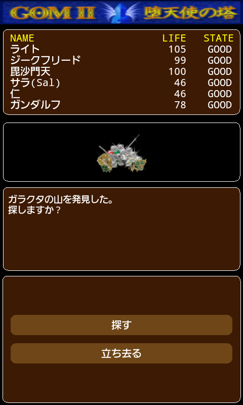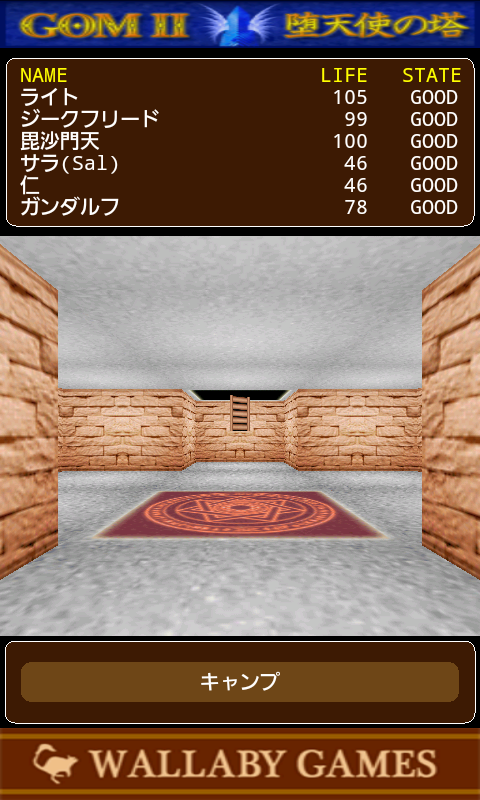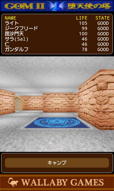 サンダルフォンシティから塔に入ると、ダンジョン画面が表示されます。 3D表示されたダンジョンの中央をタッチすると前進、左右をタッチするとそれぞれの方向に旋回します。 ※タッチしたまま押し続けると、前進や旋回を繰り返します。 「キャンプ」ボタンを押すと、ダンジョンの中でパーティがキャンプを開きます。魔法や道具の使用、隊列変更などはキャンプを開いて行います。