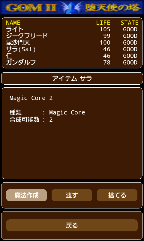 冒険中に入手した魔法の核(Magic Core)を魔法石を組み合わせて、オリジナルの魔法を作成することができます。 魔法の核(Magic Core)には様々な大きさがあり、大きな核ほど調合できる魔法石の数が多くなります。 「Magic Core 2」:魔法石を2つ調合可能。 「Magic Core 3」:魔法石を3つ調合可能。 〜 「Magic Core 8」:魔法石を8つ調合可能。 〜 ? 「キャンプ」-「アイテム」から「Magic Core」をリストから選択し、「魔法作成」ボタンを押すと、魔法調合開始です。