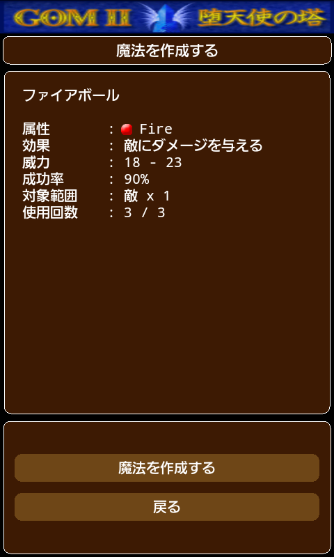 調合する魔法石の個数を選択し「魔法を作成する」を選択すると、完成する魔法の効果予想が表示されます。 魔法の効果予想が、意図したモノと異なる場合は「戻る」ボタンを選択し、直前の画面に戻ります。 意図した魔法が出来上がりそうなら、もう一度「魔法を作成する」ボタンを押し、確定させます。これで新しい魔法の完成です。